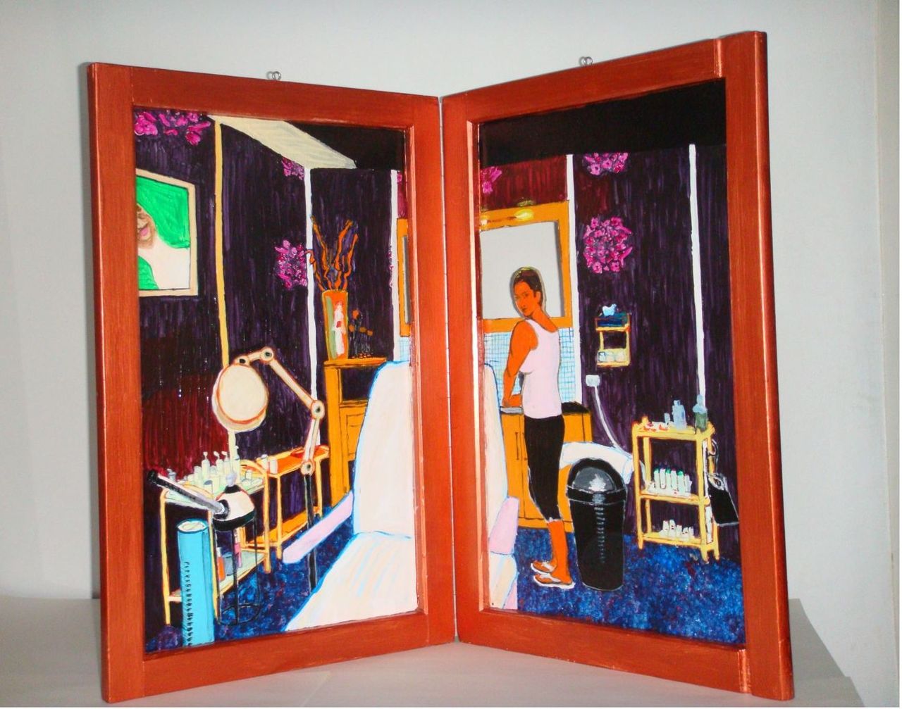 In opdracht. Tweeluik op houten paneel, Salon Tanja in stijl van Matisse. Acrylverf op hout.