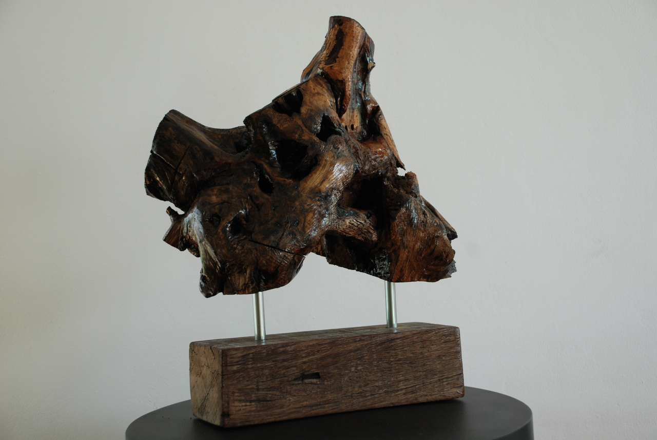 Gemaakt van een wortelstuk van beukenhout. Afgewerkt met beits.