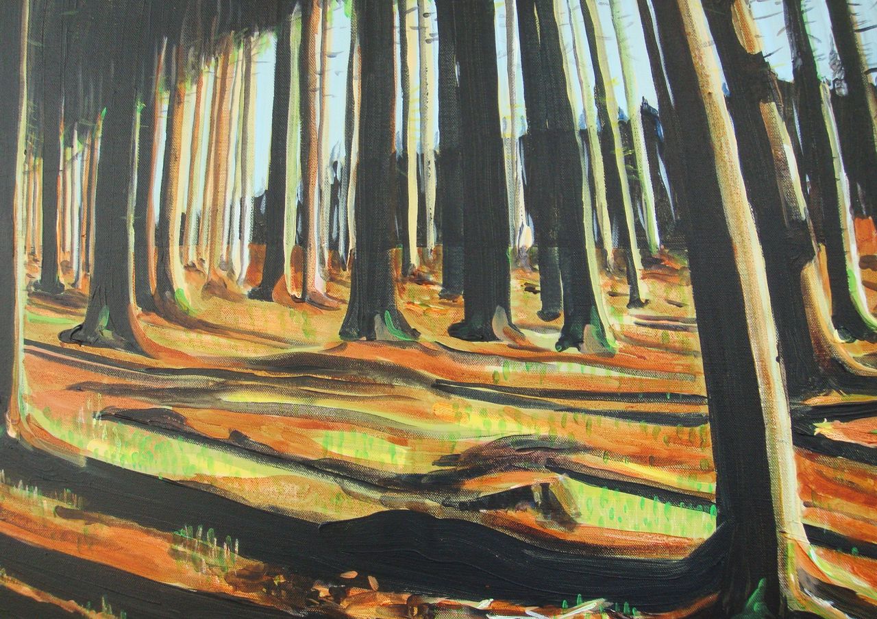 Bomenrij langs de weg. Schilderij in acryl op doek met kleuren oranje, bruin en zwart.