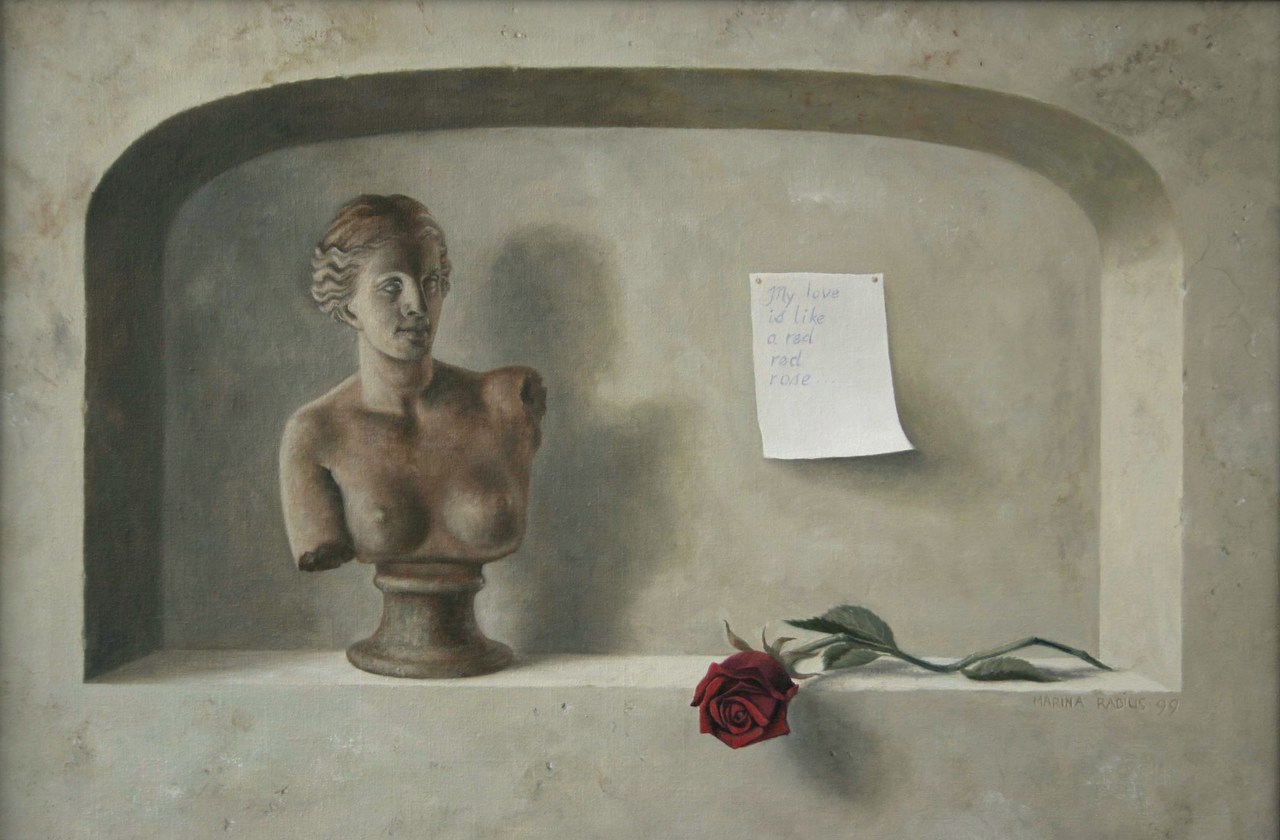 Een schilderij met liefdessymbolen: Afrodite, een (gedeelte van) een gedicht van Robert Burns, en een rode roos.