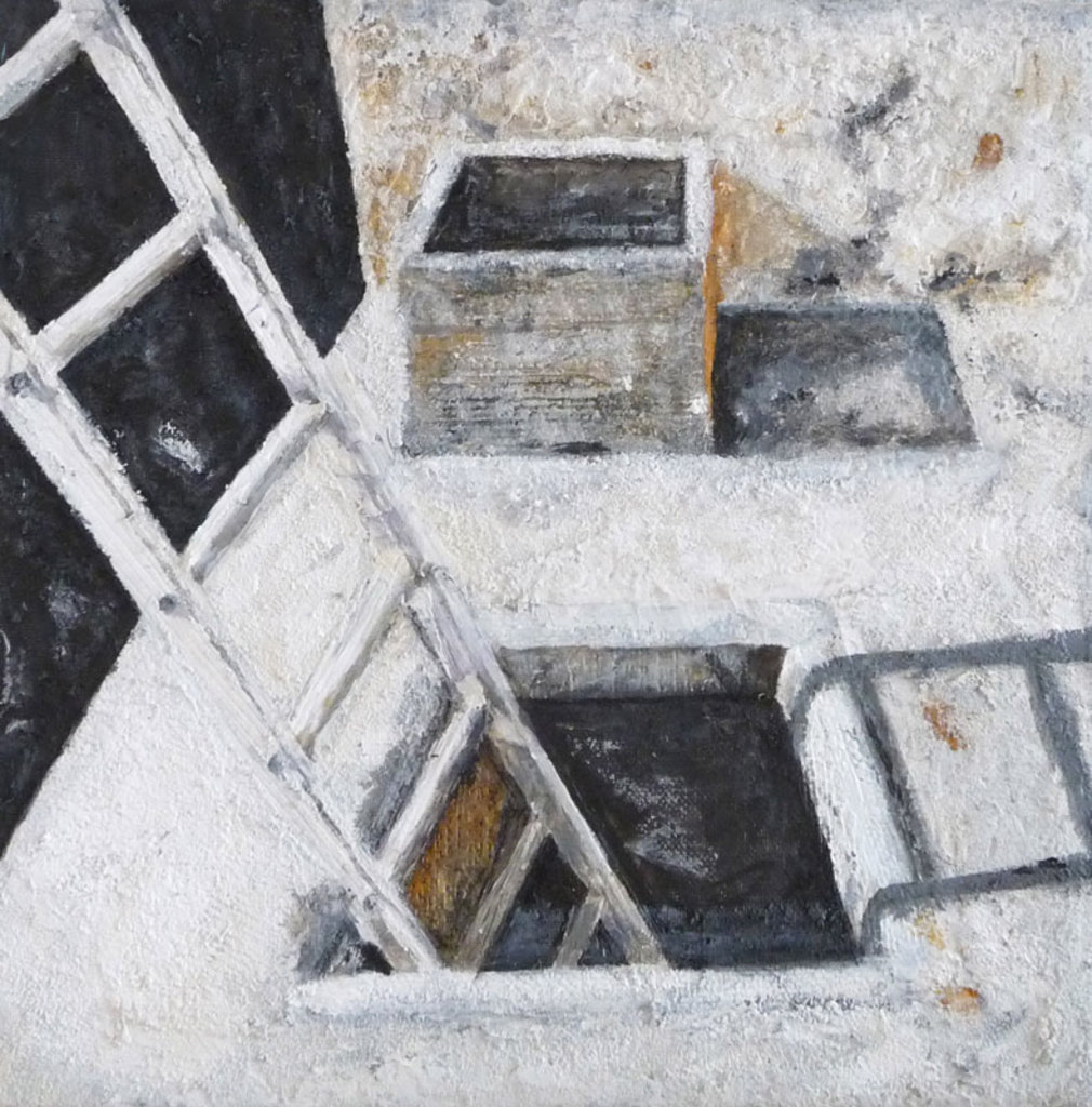 Iets in de buitenwereld intrigeert mij en door deze impressie uit te werken wordt zij blijvend deel van mijn binnenwereld. Laag na laag bouw ik aan de uiteindelijke vorm. Tijdens het werken komt er een stroom van associaties op gang. Het is een constant zoeken naar evenwicht tussen de verf en de andere materialen.