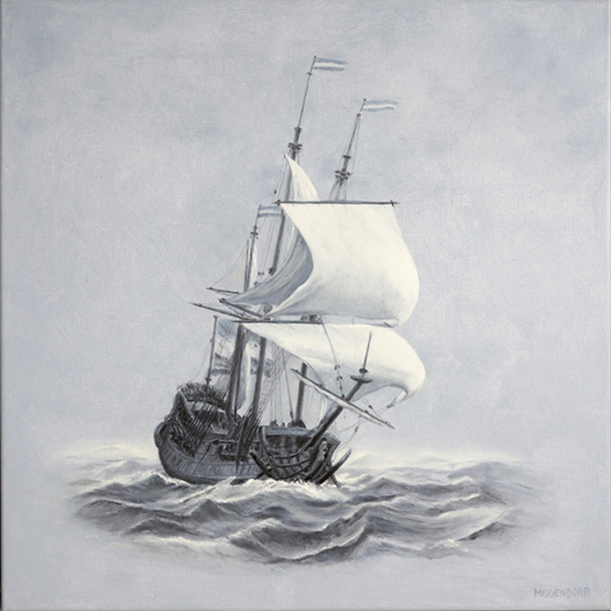 Een interpretatie van 'Schilderij met voorstelling van twee driemasters' dat wordt toegeschreven aan Willem van der Velde de Jonge. Hier zien we er slechts een; het origineel toont een tweede driemaster op de achtergrond.