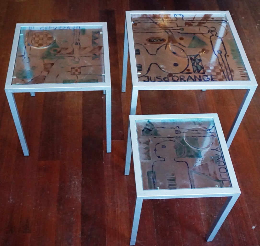 Drie stalen bijzettafeltjes met glas. Glas is floatglas met ingebakken figuratieve grafische voorstelling. Elk glas heeft een ronde verdieping. Kleuren turkoois, oudroze en kobaltblauw. Tafel one: H 46 cm B/D 43 cm. Tafel two: H 42 cm B/D 37 cm. Tafel three H 38 cm B/D 31 cm.