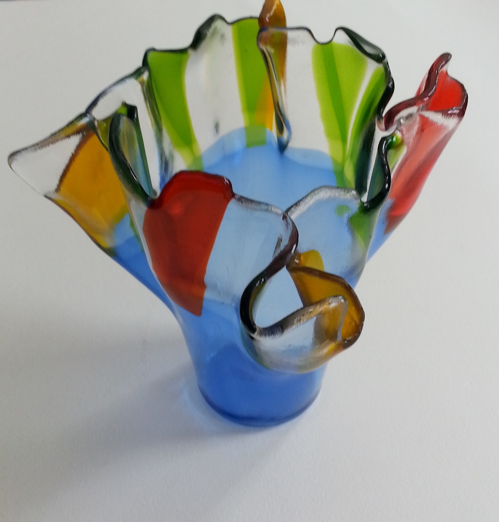 Lichtblauw plooivaasje met rood, geel en groen in Bullseyeglass.