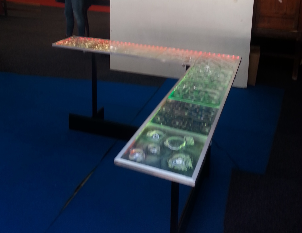 Glasobject tafelopstelling van vierkanten platen floatglas en ingebakken luchtbellen in aluminiumframe en ledverlichting en houten onderstel.