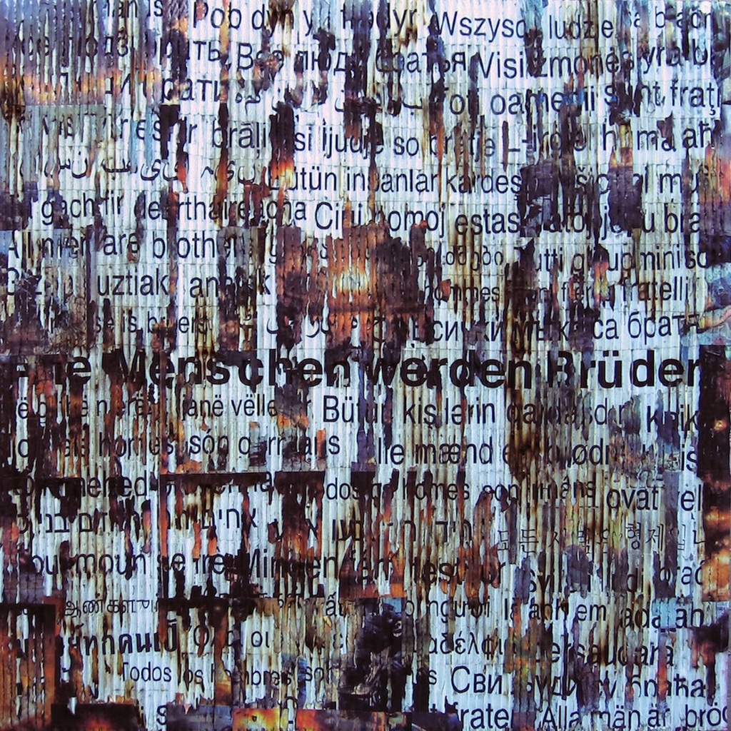 Cultere Burning #5 Alle menschen werden Brüder Collage: tekst in 54 talen Golfkarton op mdf, tekst in 54 talen, persfoto’s oorlog (afgebrand) 80x80x2 2014