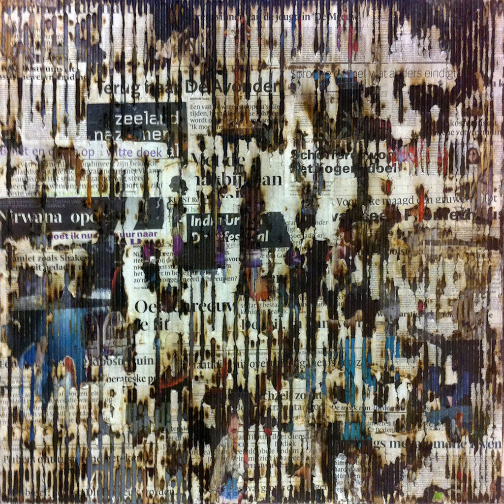 Culture Burning #6: collage Podium kunsten golfkarton op mdf, persfoto's persrecencies(afgebrand) 80x80x2 2015