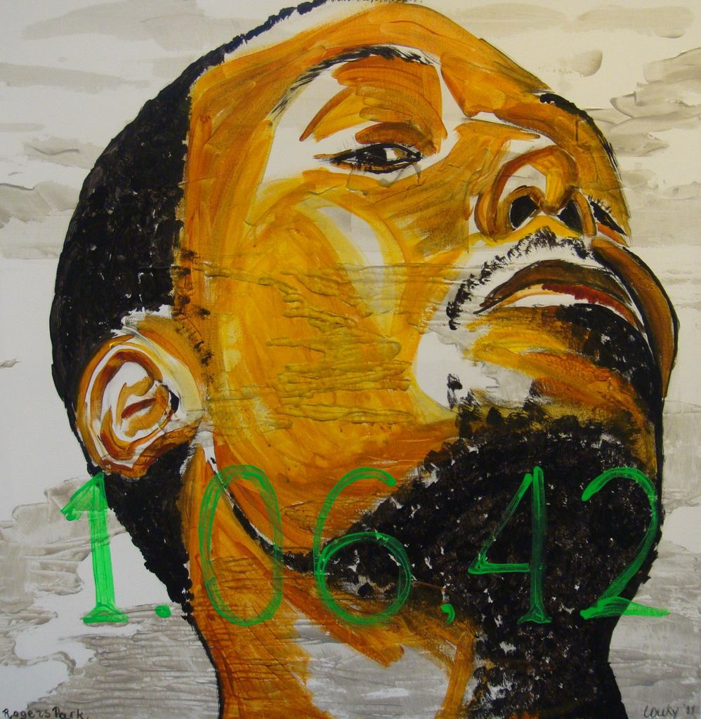 Schaatser Shani Davis kijkt uit zijn appartementraam aan Roger's Park naar Lake Michigan, denkend aan het record dat hij ooit schaatste. Acryl op doek.