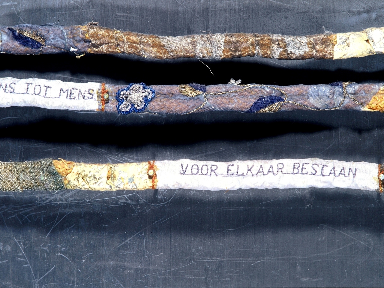 Detail van het kunstwerk 'Levenslijn', met de tekst ...' voor elkaar bestaan'...