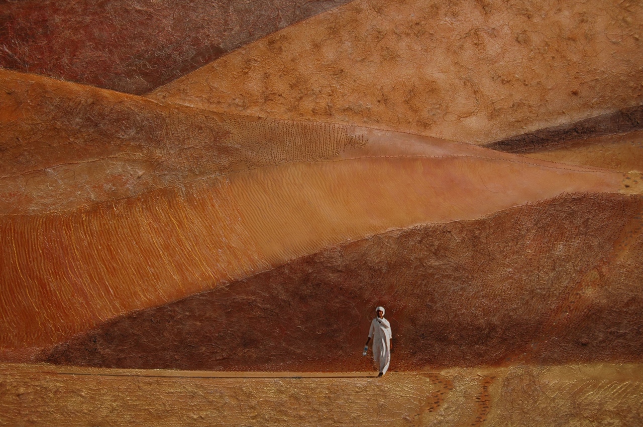 Fotokaart van detail van het kunstwerk 'Biddende man in de woestijn'..