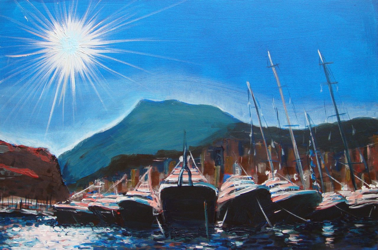 Boten in de haven van Monaco, acryl op doek.