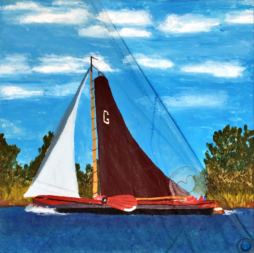 "Skûtsje" is een cadeau voor 50-jarig huwelijk jubileum. Stuk zeildoek van zeilmakerij waar de man gewerkt heeft is verwerkt in het schilderij als zeil van het skûtsje zelf.