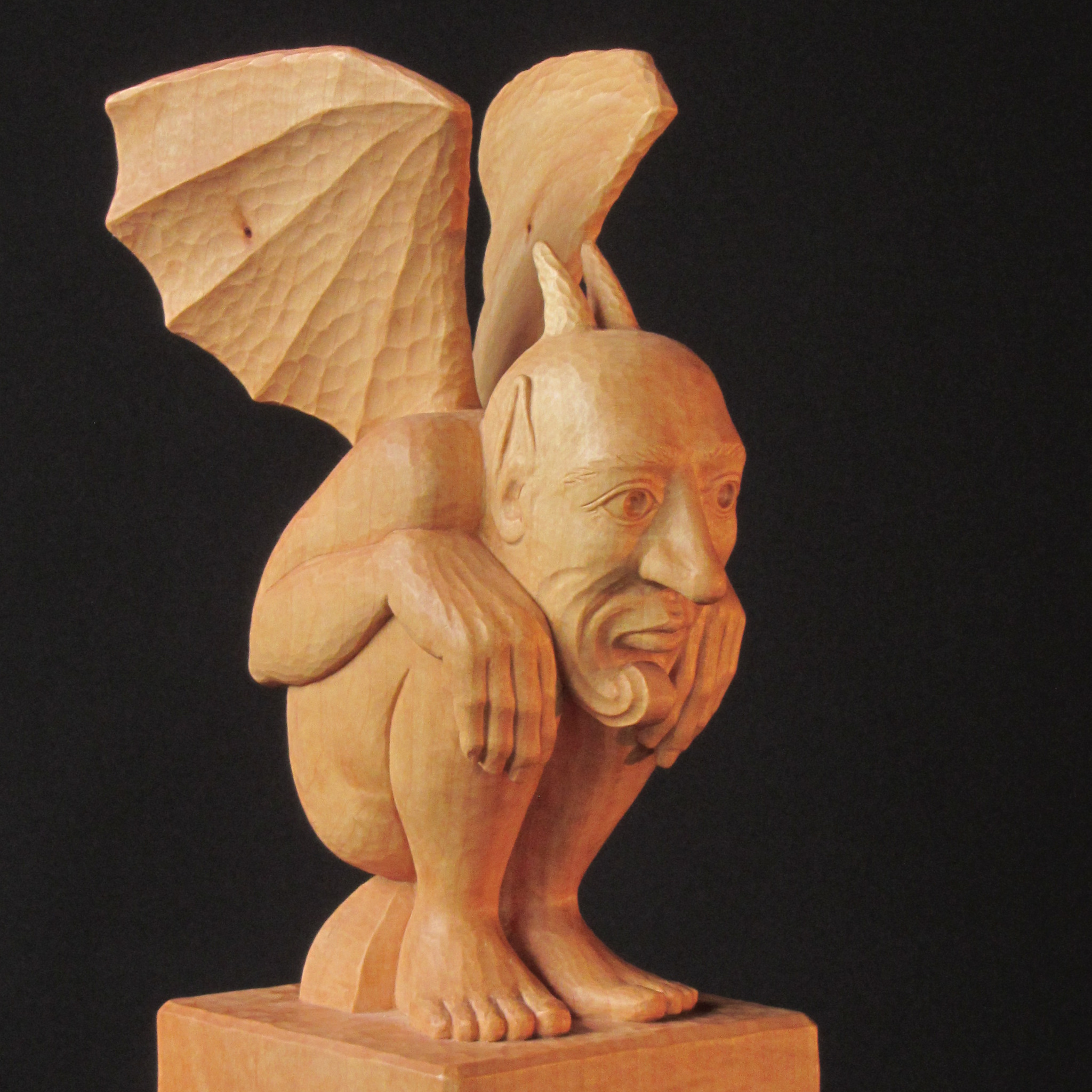 Deze Imp is combinatie van mens en vleermuis. Klaar om zich van de rand van een oude kerk te laten vallen en je schrik aan te jagen. Imps, vermoedelijk afkomstig uit de Duitse mythologie, behoren tot de duiveltjes, maar dan van de laagste orde, meer een plaaggeest. Gebaseerd op een ontwerp van Shawn Cipa. Houtsoort: Linden. Hoogte incl. voet van 6 cm.