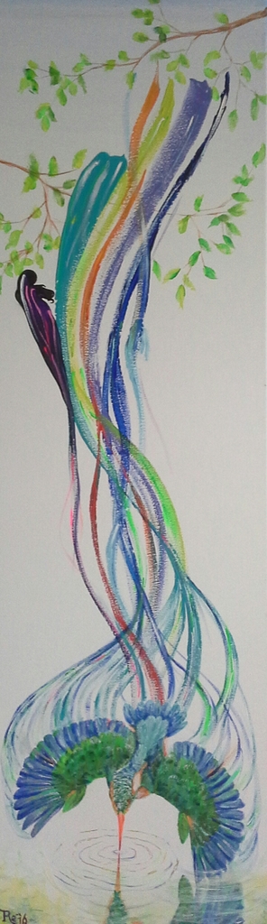 Om mijn kleuren te laten duiken bedacht ik me dat door een ijsvogel te laten doen. Tijdens de duik via mijn penselen naar de ijsvogel ontstond een duikende vlucht aan kleuren op mijn doek.