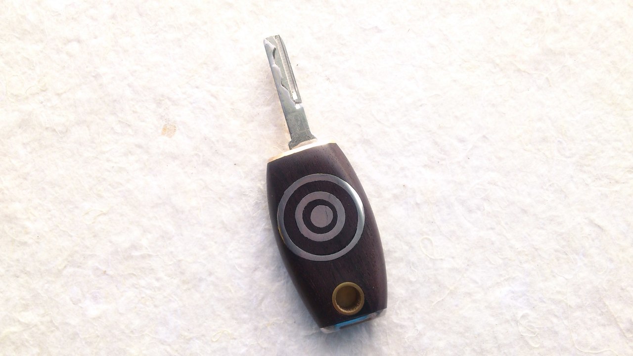 Deze auto sleutel heb ik gemaakt voor een collega omdat zijn auto sleutel was gebroken. Hij bestaat uit grenadille ,een hele harde afrikaanse houtsoort ,die is ingelegd met 50-50 soldeer aan de voorkant zit een plaatje messing en aan de achterkant zit een plaatje van een zaagblad omdat die goed te polijsten is en tevens goed bestand tegen krassen. De oog is gemaakt van een messing buisje