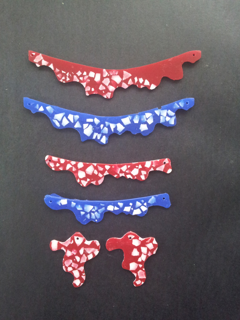 halssieraad: rode of blauwe giethars gecombineerd met eierschaal : € 20; oorbellen in rood erbij: € 15