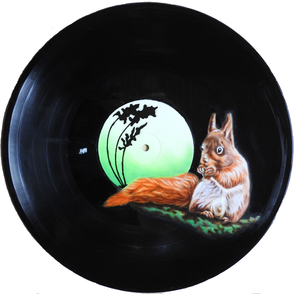 Eekhoorntje geschilderd op een elpee.