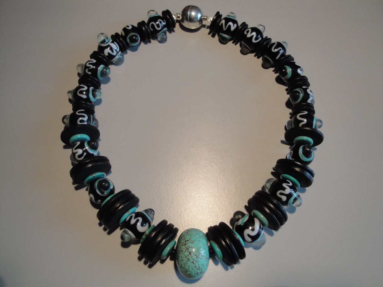 glaskralen, cocos- en turkooisschijfjes en in het midden een turkoois kraal; zilverkleurig magneetslot; lengte 50 cm.
