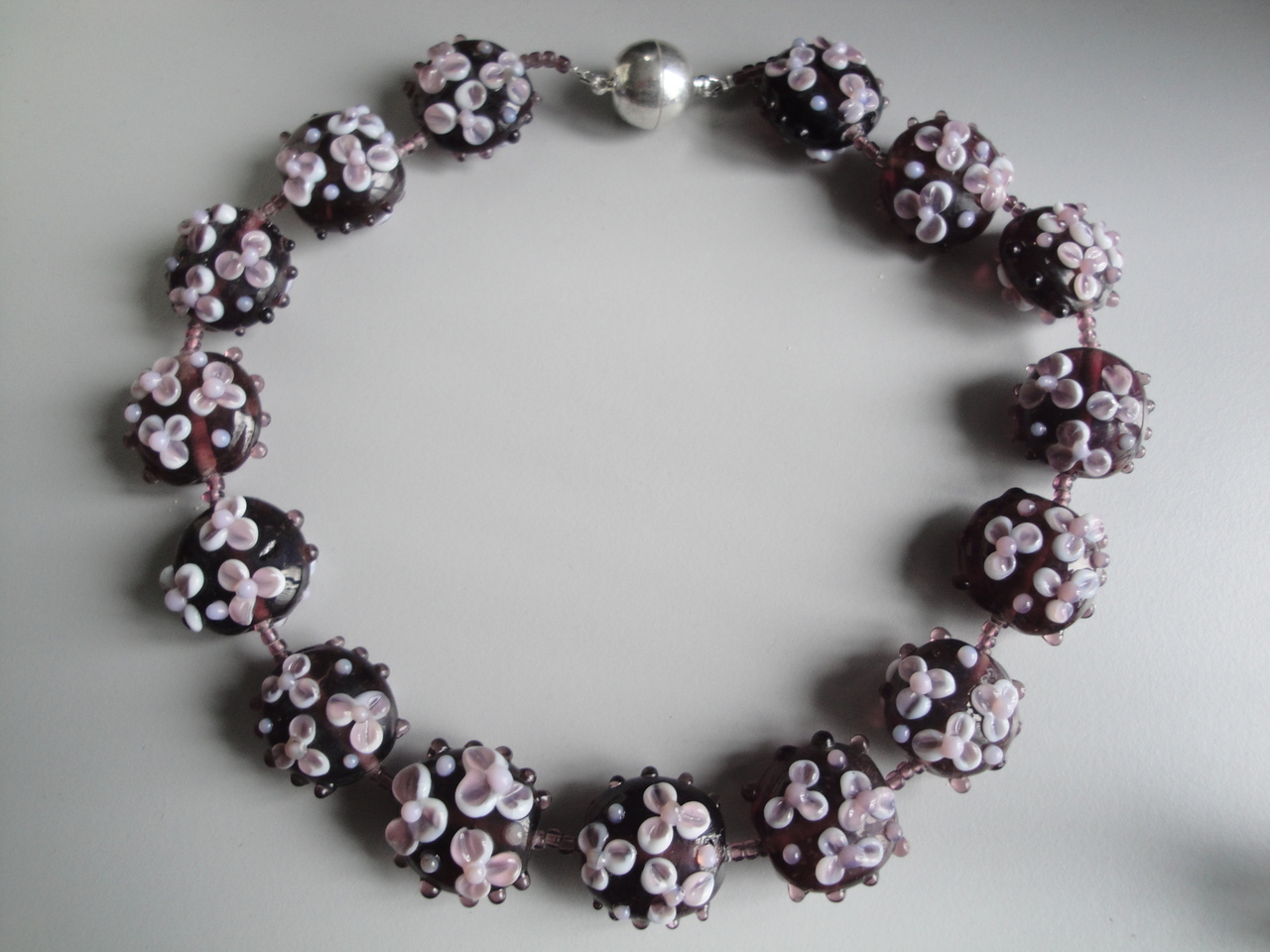 auberginekleurige glaskralen met rose bloemblaadjes aan twee zijden van de kraal; zilverkleurig magneetslot; lengte ongeveer 46 cm.