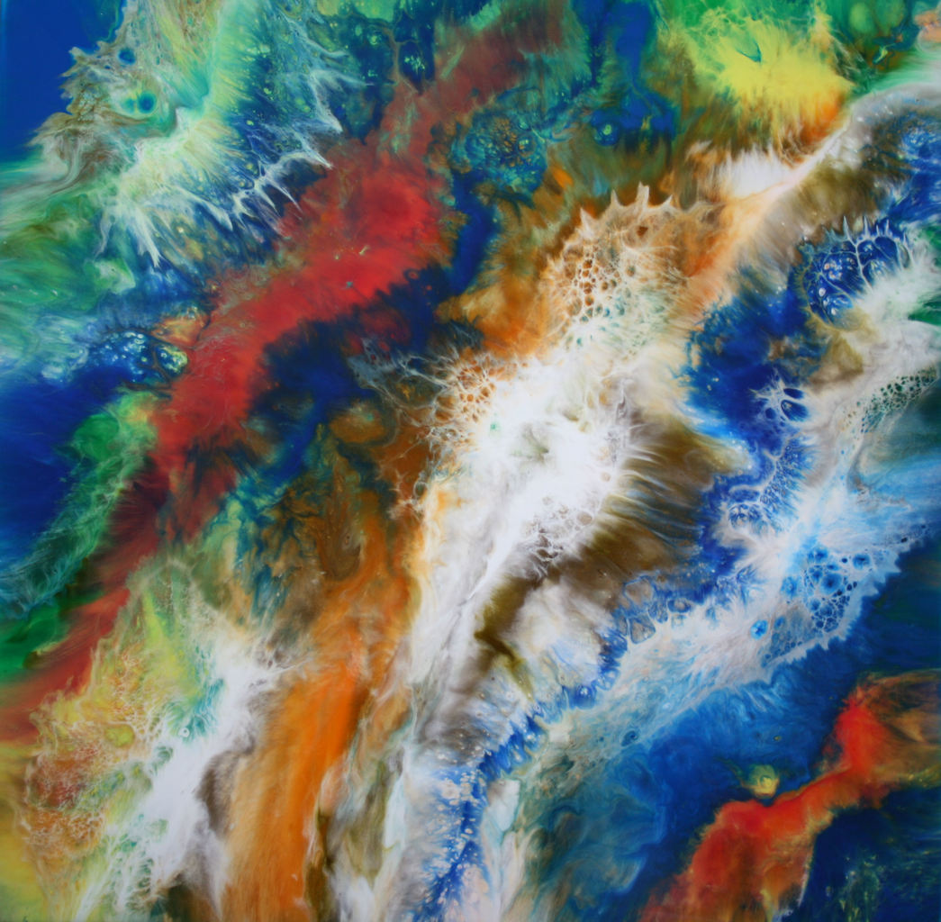 Colour, veelkleurig schilderij. Epoxyhars welke aangekleurd is met pigmenten. Deze schilderijen hebben door de hoogglans een prachtige diepte.