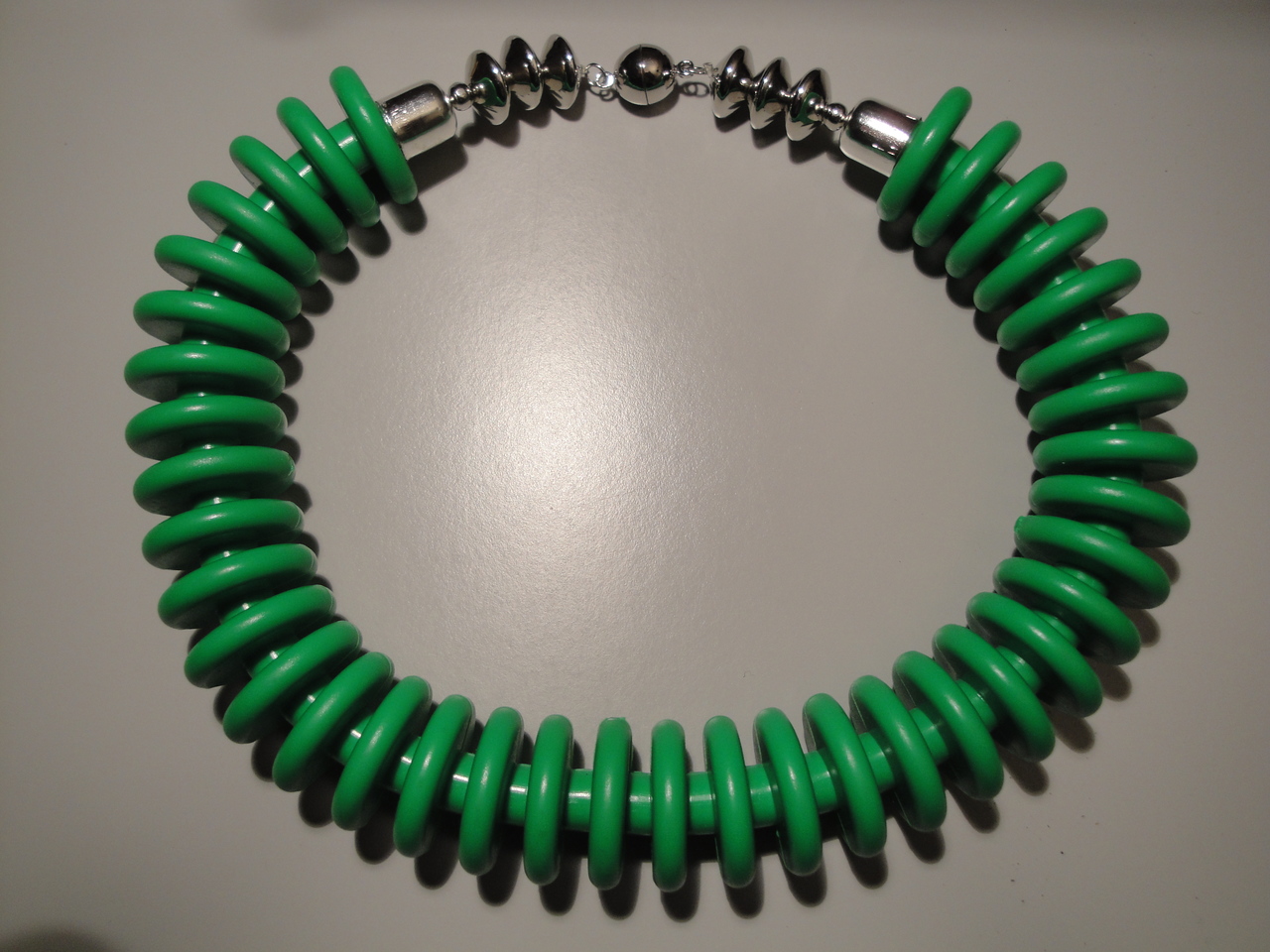 kunststof halssieraad; kleur grasgroen; zilverkleurig magneetslot. lengte 45 cm, dikte 2,8 cm