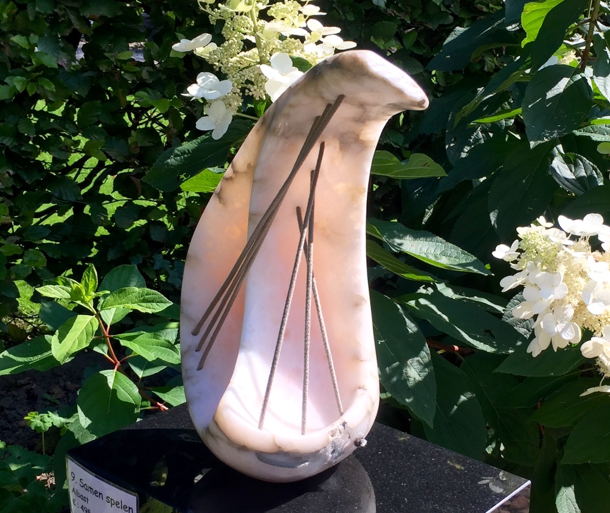 Een beeld van roze albast dat besnaard is aan beide kanten. Twee mensen kunnen hun leven fraai op elkaar afstemmen om blijvend gelukkig te zijn.