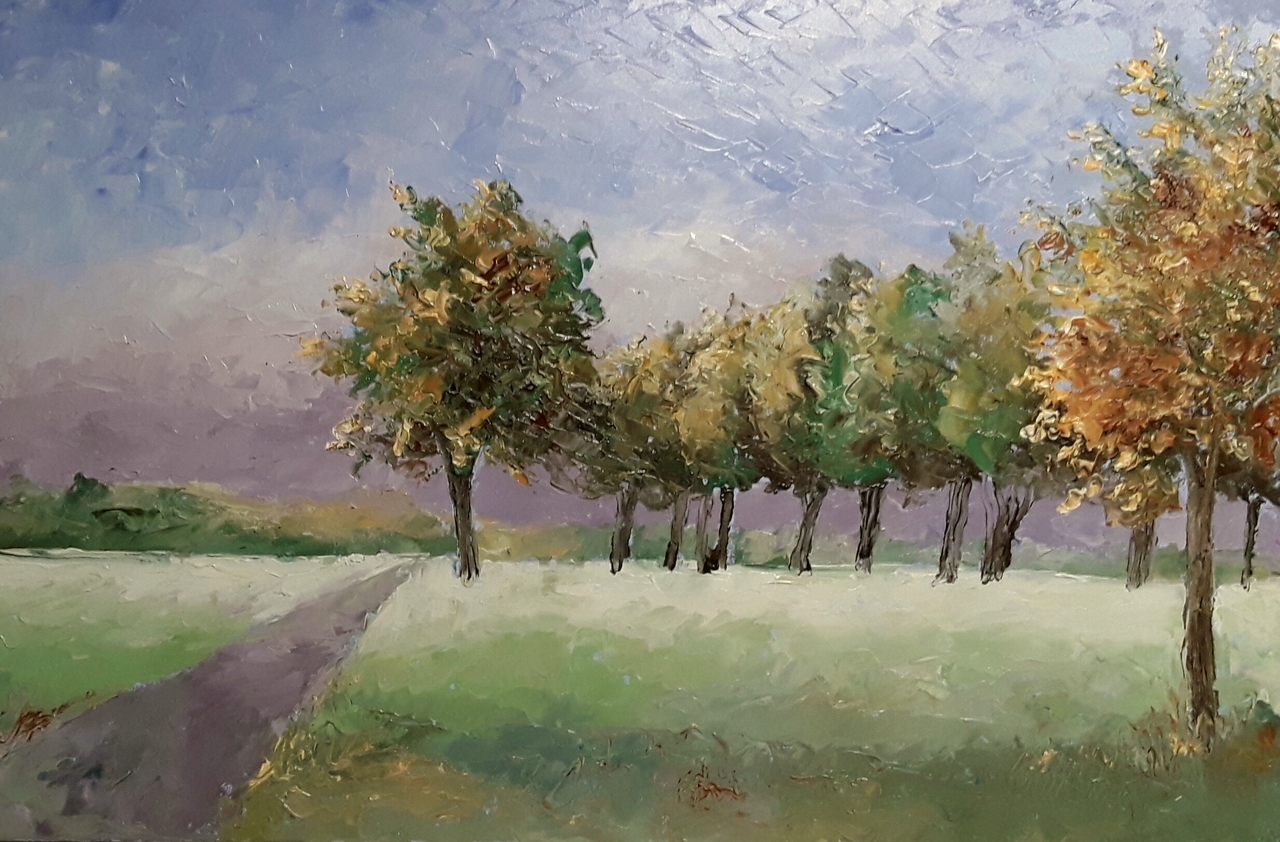Groep bomen, plein air geschilderd met paletmes.