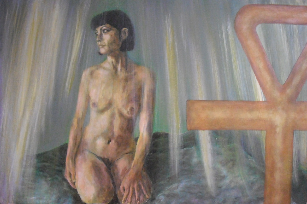 Model Esther naakt met op de voorgrond het Egyptisch ankh-symbool. Het geheel ademt een ''Cleopatra sfeer''.