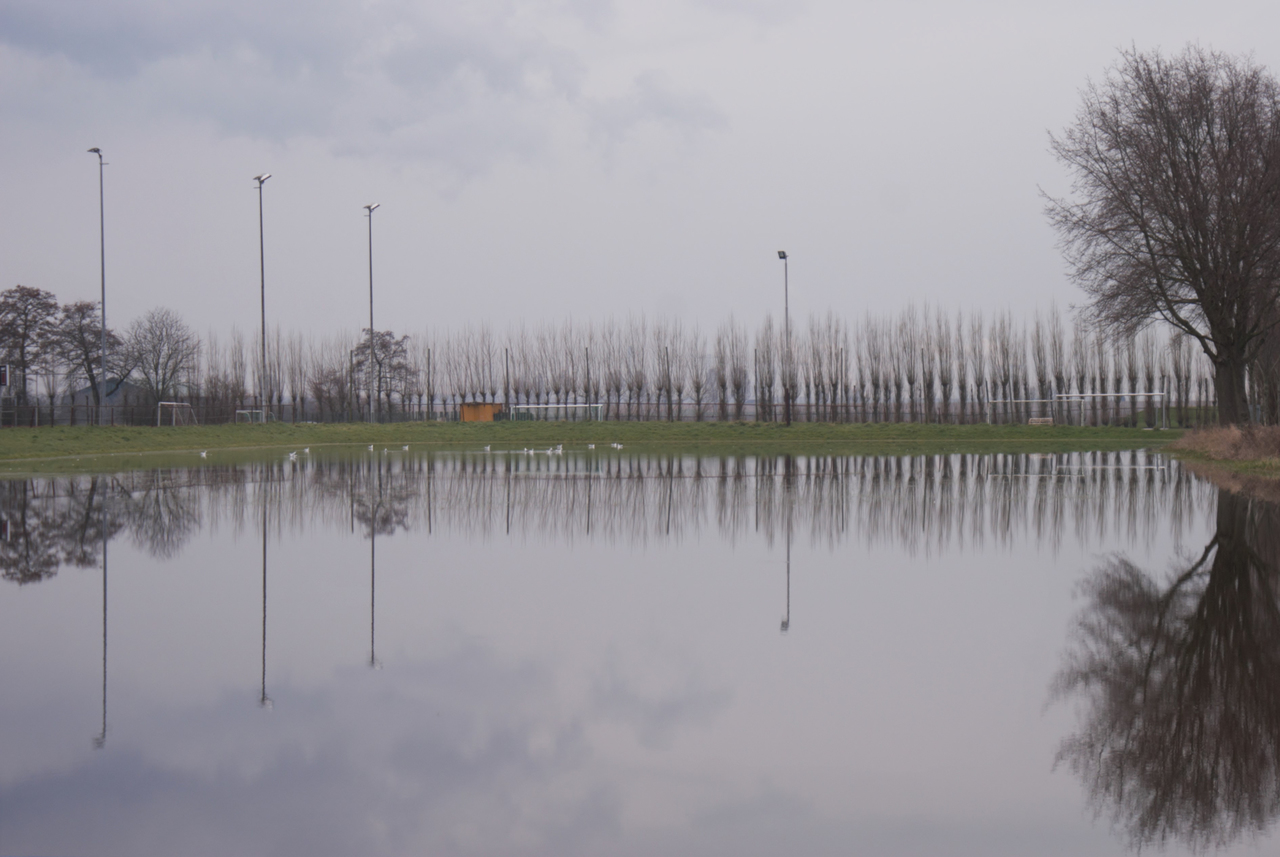 Dit is de plaatselijke ijsbaan van Piershil. De ijsbaan is licht dichtgevroren. Hierdoor is er een mooie spiegeling ontstaan. Er ontstaat een strakke belijning in de foto, waardoor er een grafisch element ontstaat.