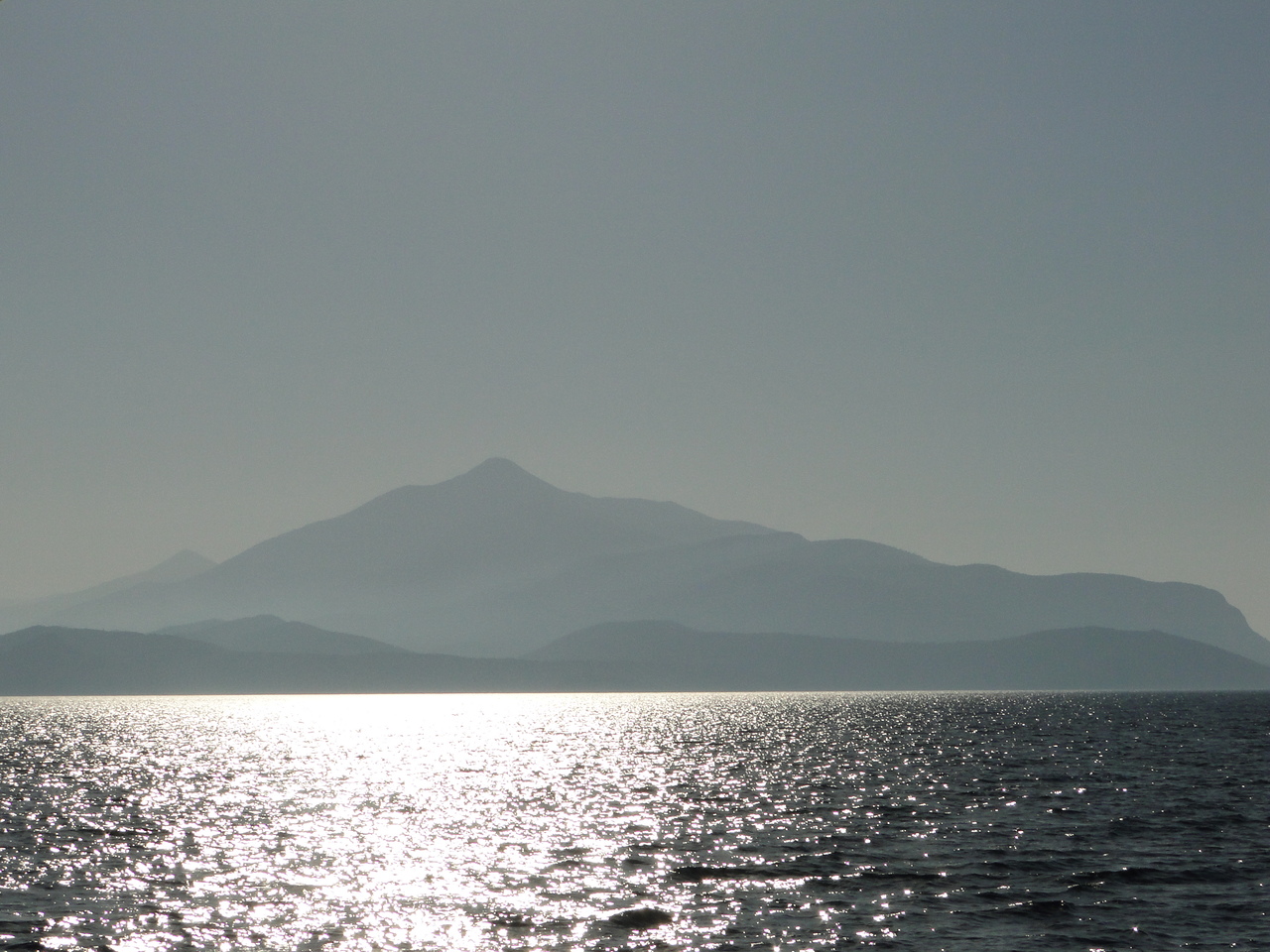 Het vuur van de zon beschijnt het water, de aarde krijgt een andere kleur en het water schittert.