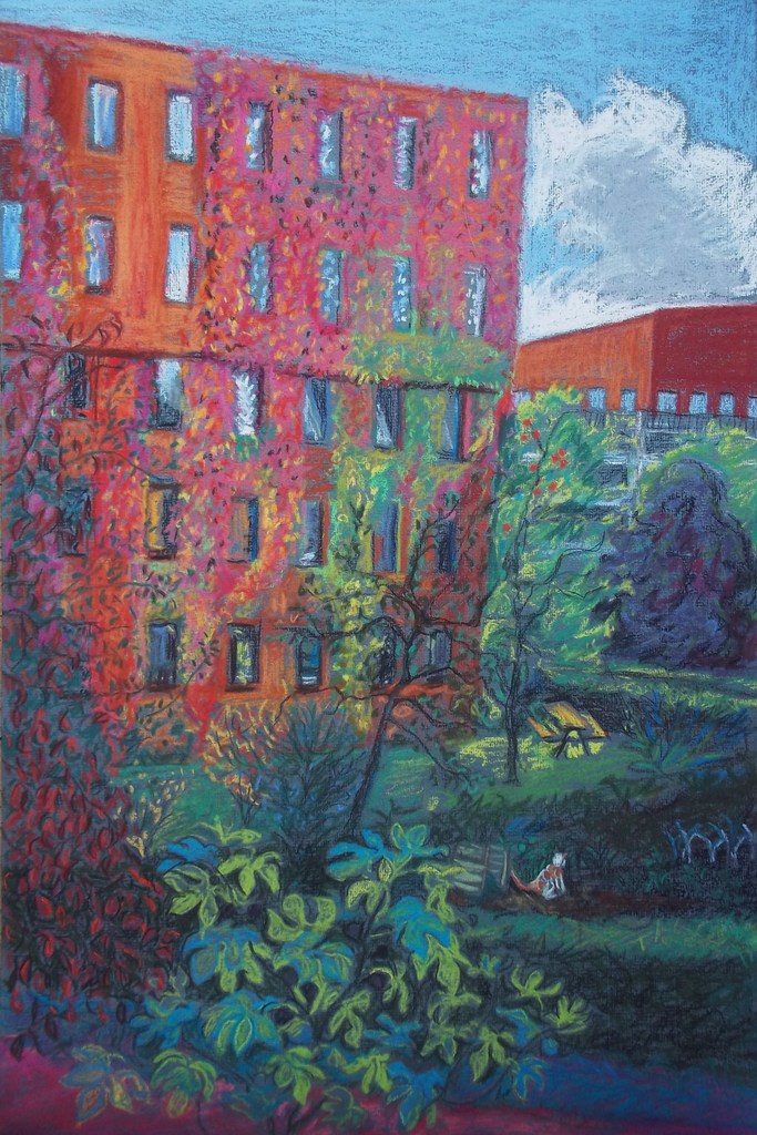 Een heldere herfst dag laat de kleuren van bouwstenen en planten mooie samenwerken in deze uitzicht vanaf de spirale trappenhuis van blok 11.