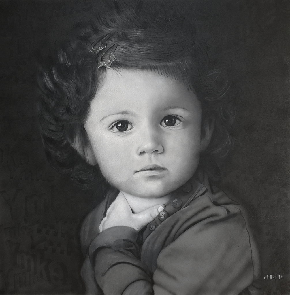 Ymke, de prachtige dochter van Peter en Monique. Airbrush op paneel afgewerkt met penseel.
