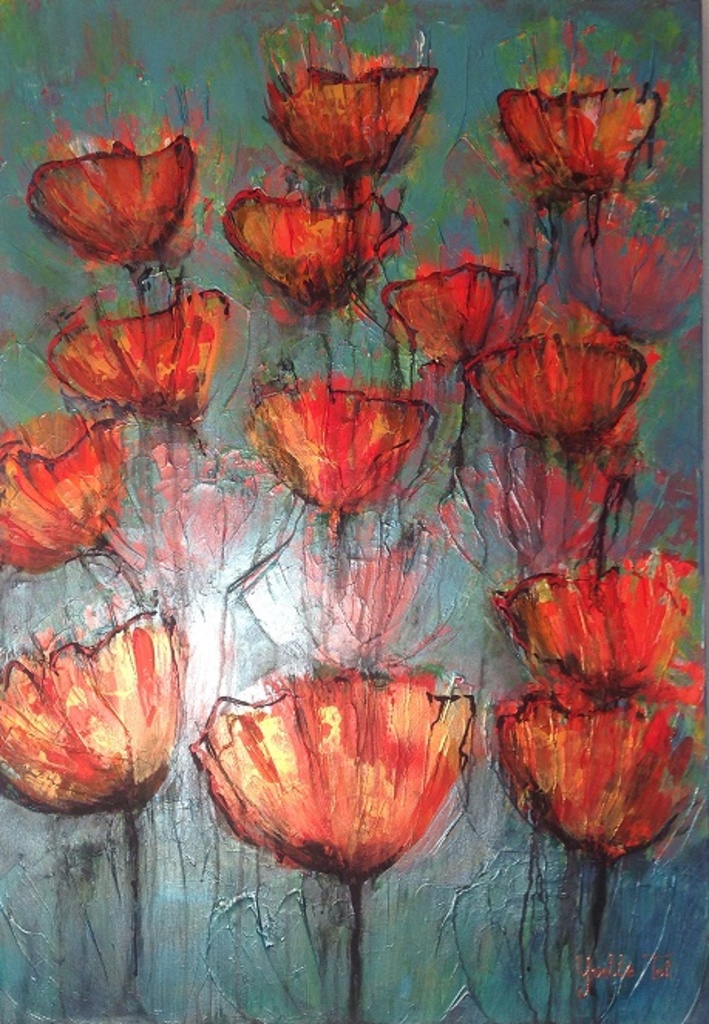 Klaprozen 1 in acryl, hooglans en parelmoer