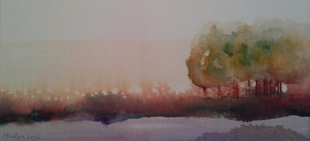 Pure aquarel van een bijzondere middag buiten in het wijde land. De maten van de aquarel zijn 17 x 8 cm. De totale inlijsting met passepartout is 30 x 24 cm. Prijs is inclusief inlijsting.