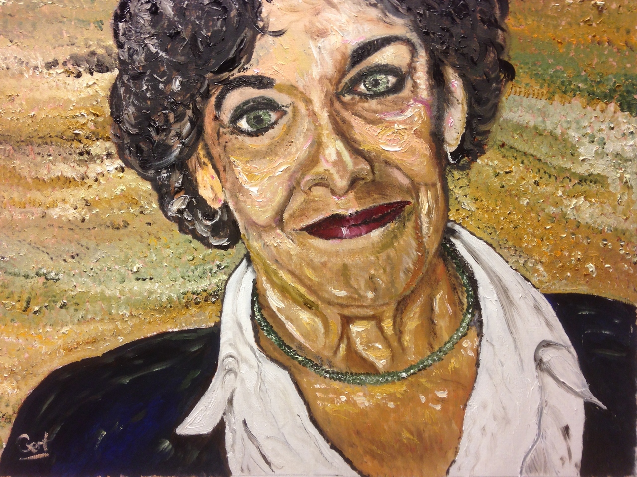 Dit portret van Hanneke Groenteman heb ik geschilderd voor het project 'portretten van sterren' van het atelier Spiegel van de Ziel. Desgevraagd schrijft zij er het volgende over: "Ik vind het heel knap. Ik zou het helemaal nooit kunnen, maar het geeft mij geen fijn gevoel. Een mens ziet zichzelf nooit door andermans ogen, en dat is in dit geval ook zo, ik zie mezelf niet zo. Maar het lijkt wel. Knap geschilderd, maar behoorlijk confronterend om naar te kijken."