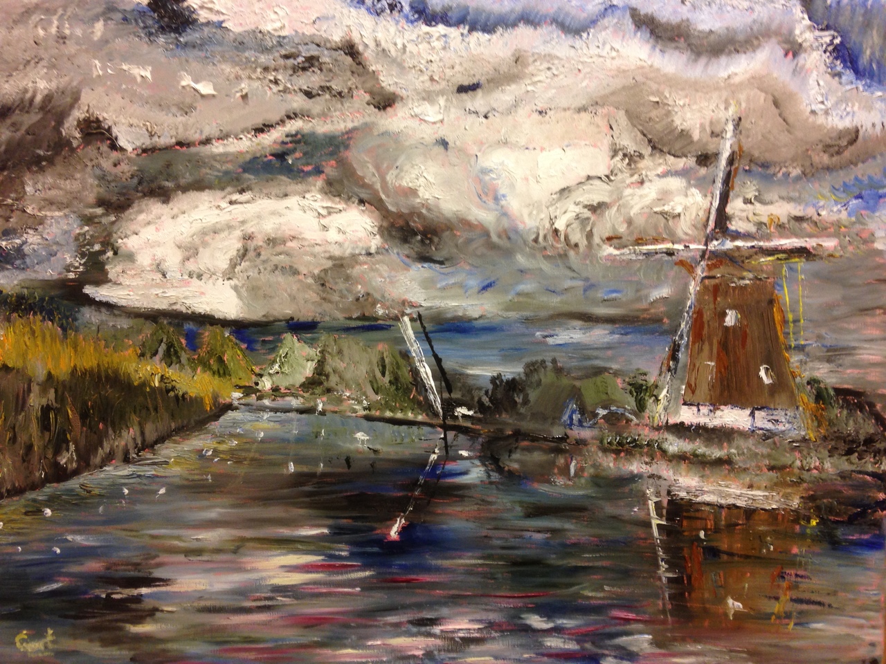 De Oostzijdse molen aan het riviertje Het Gein bij Abcoude staat in een inspirerende omgeving. Vooral de weerspiegelingen in het water fascineren, zeker als er een indrukwekkende wolkenlucht boven hangt. Mondriaan heeft deze molen wel 20 keer geschilderd. Dit is mijn 'first impression'.