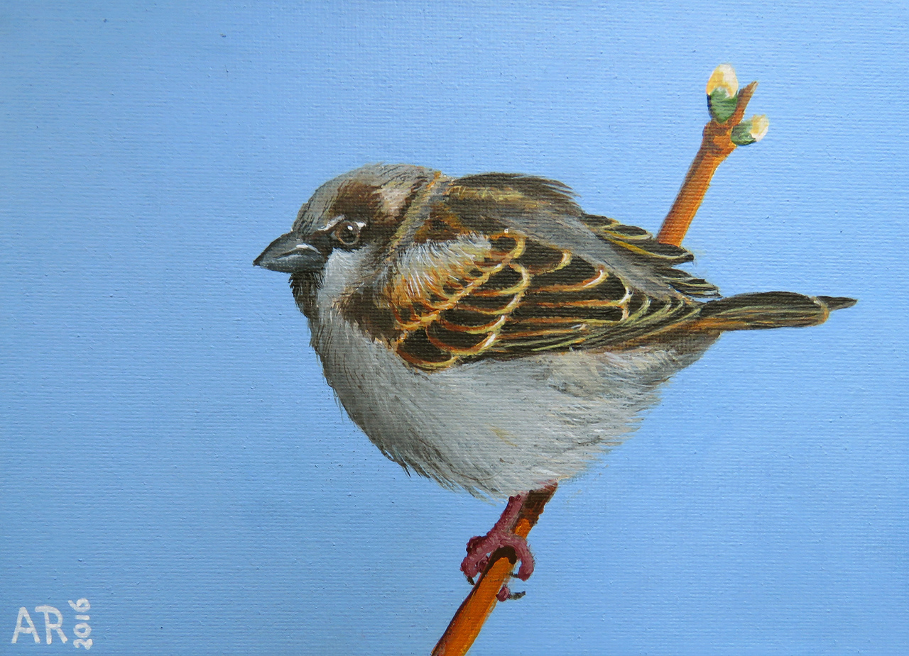 Acryl Vogel Dier Painting Schilderijtje Mus Wenskaart Sparrow Kunstkaart