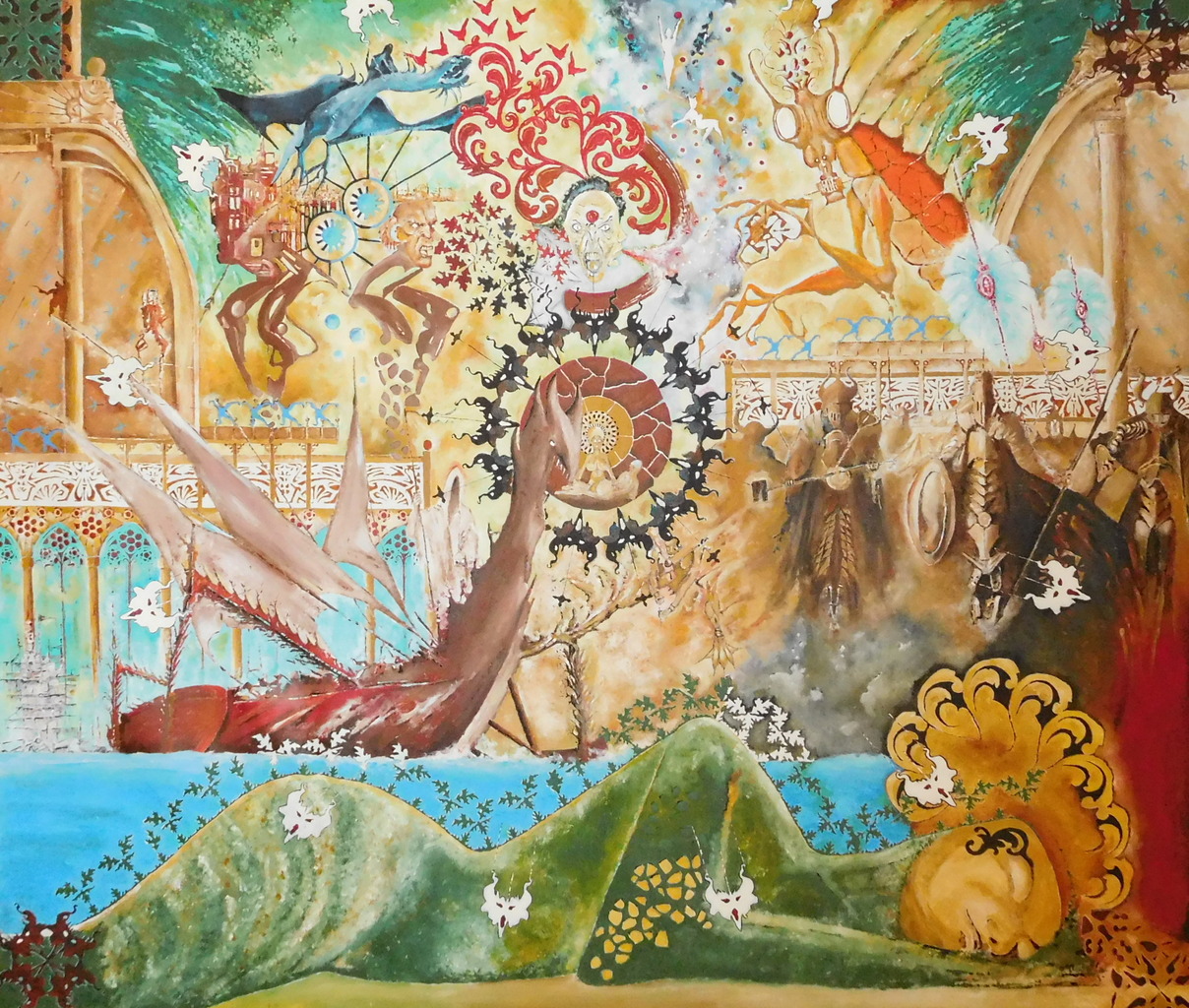 Het doek toont een liggend met vegetatie begroeid beeld met een bonte verzameling van realistische en surrealistische objecten dat de droom weergeeft.