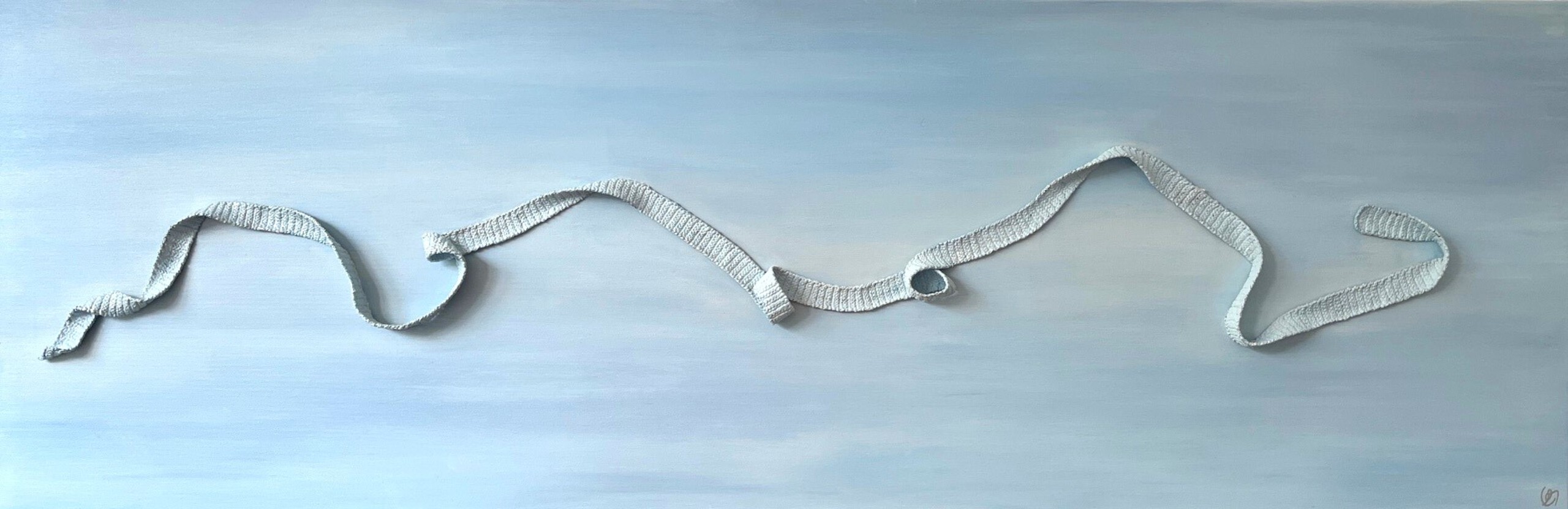 Geinspireerd door de zee bij Ameland. De strook op het doek is gehaakt. De achtergrond is opgebouwd uit meerdere lagen acrylverf.