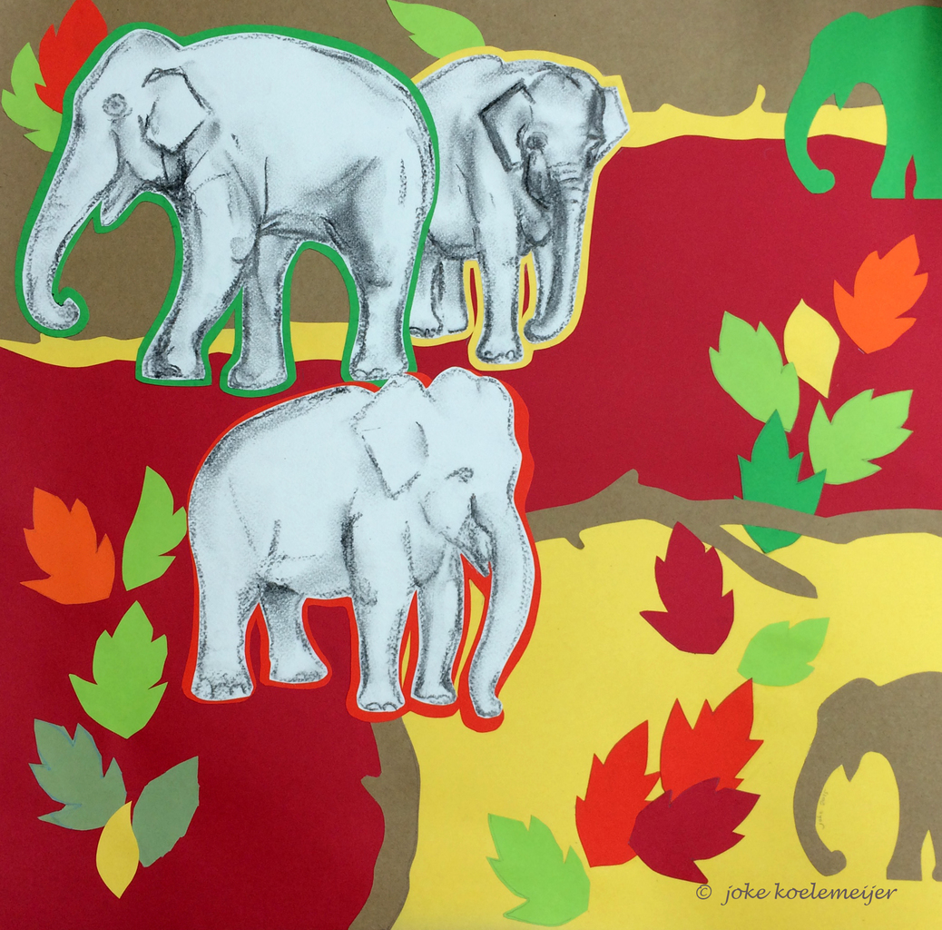 Rood Oranje Geel Bruin Glas Lijst Houtskool Collage Olifanten Matisse Artis Schetsen Knipsels