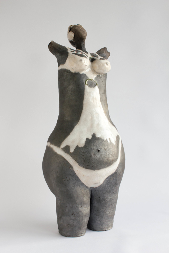 Deze dame is gekleed in een moderne bikini. Door het gebruik van witte glazuur komt dit goed tot z'n recht. De dame is afgestookt op de Raku manier. Dit is een oosterse manier van keramiek stoken.