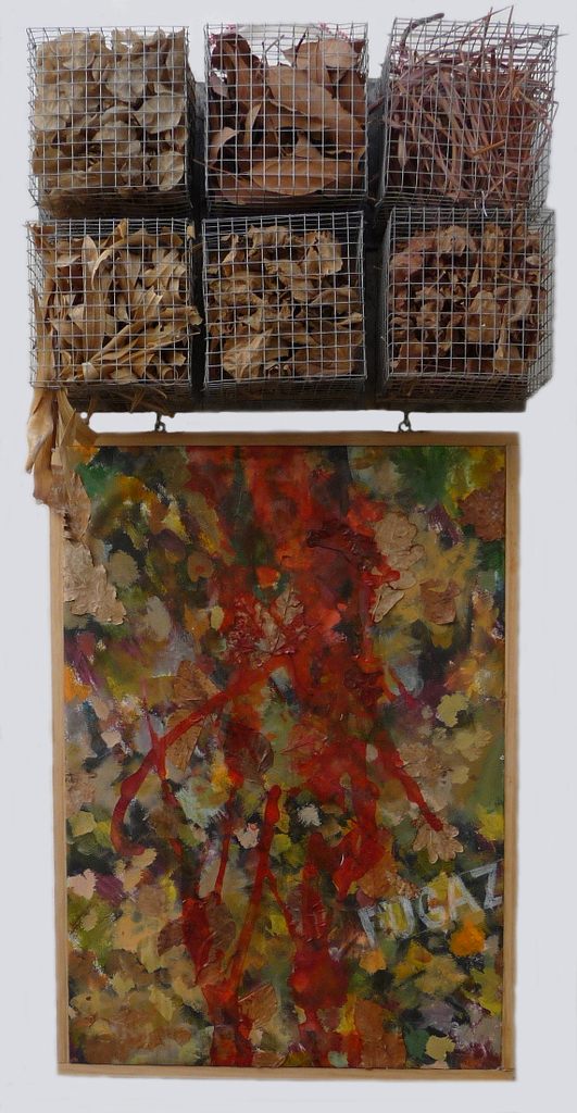 hout, lood, kippengaas, metaaldraad, gedroogde bloemen en bladeren, verf, ecoline en wit potlood