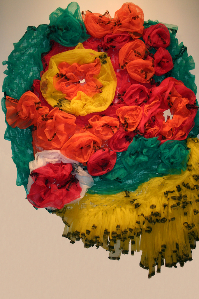 Wandkleed opgebouwt uit verschillend kleuren steigergaas welke vast genaaid zijn aan plastic antimollen gaas. Het werk is tevens onderdeel van een ruimte vullende iinstallatie met meerder hangende, staande en liggende objecten gemaakt van steigergaas.