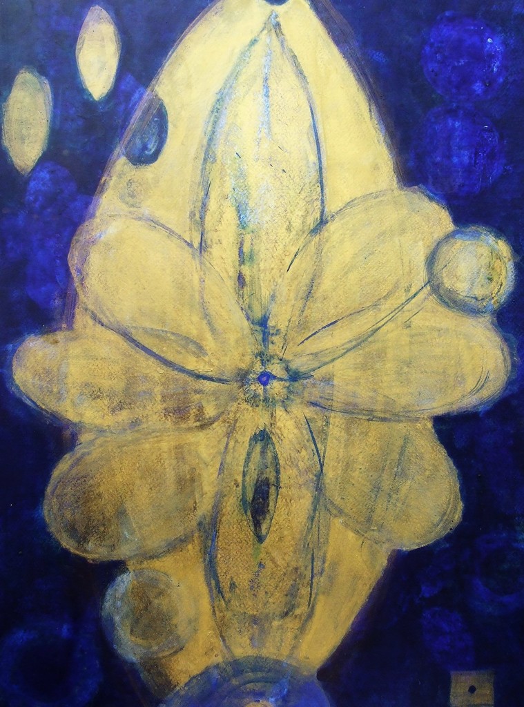 Vele lagen van cobalt- en goudkleurige pigmenten maken deze compositite intens.