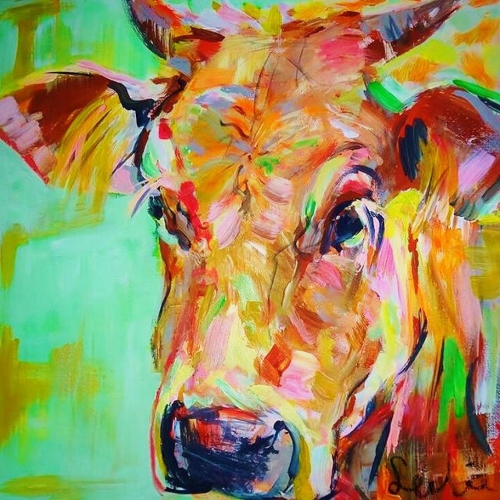 Schilderij Oranje Acryl Groen Portret Kleurrijk Koe Portrait Painting Roze Cow Linnen Usa Verkocht Colorful Newyork Kunstkaart Sold Serlie