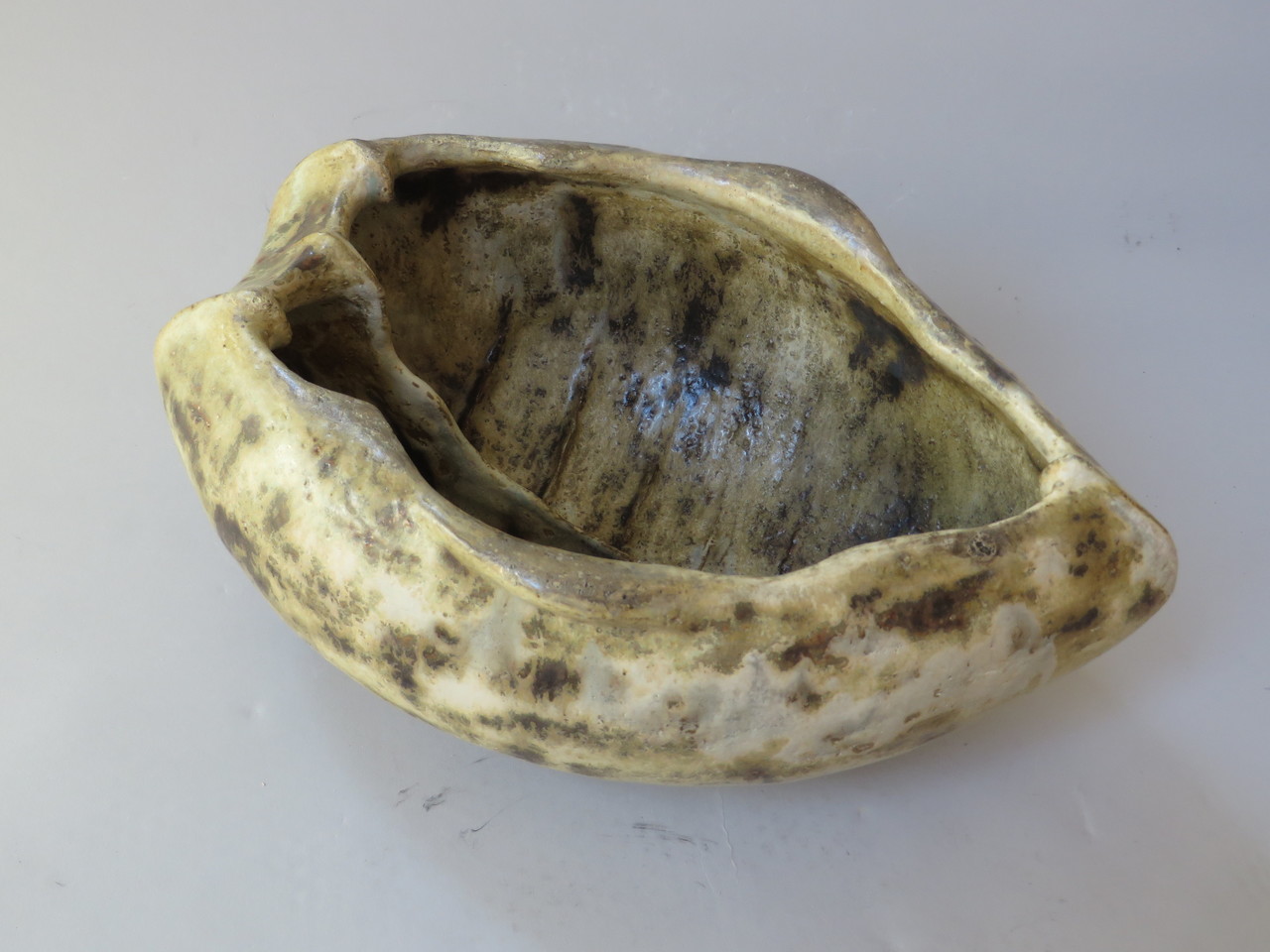 Keverschild op z'n rug, opengewerkt, steengoed, glazuur.