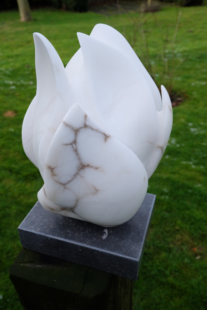 Flower of Life, de wens om te willen leven, bloeien, in schoonheid en kwetsbaarheid. De steen, een witte albast, heeft enerzijds de 'littekens' van het leven, en anderzijds is zij dun en transparant uitgewerkt.
