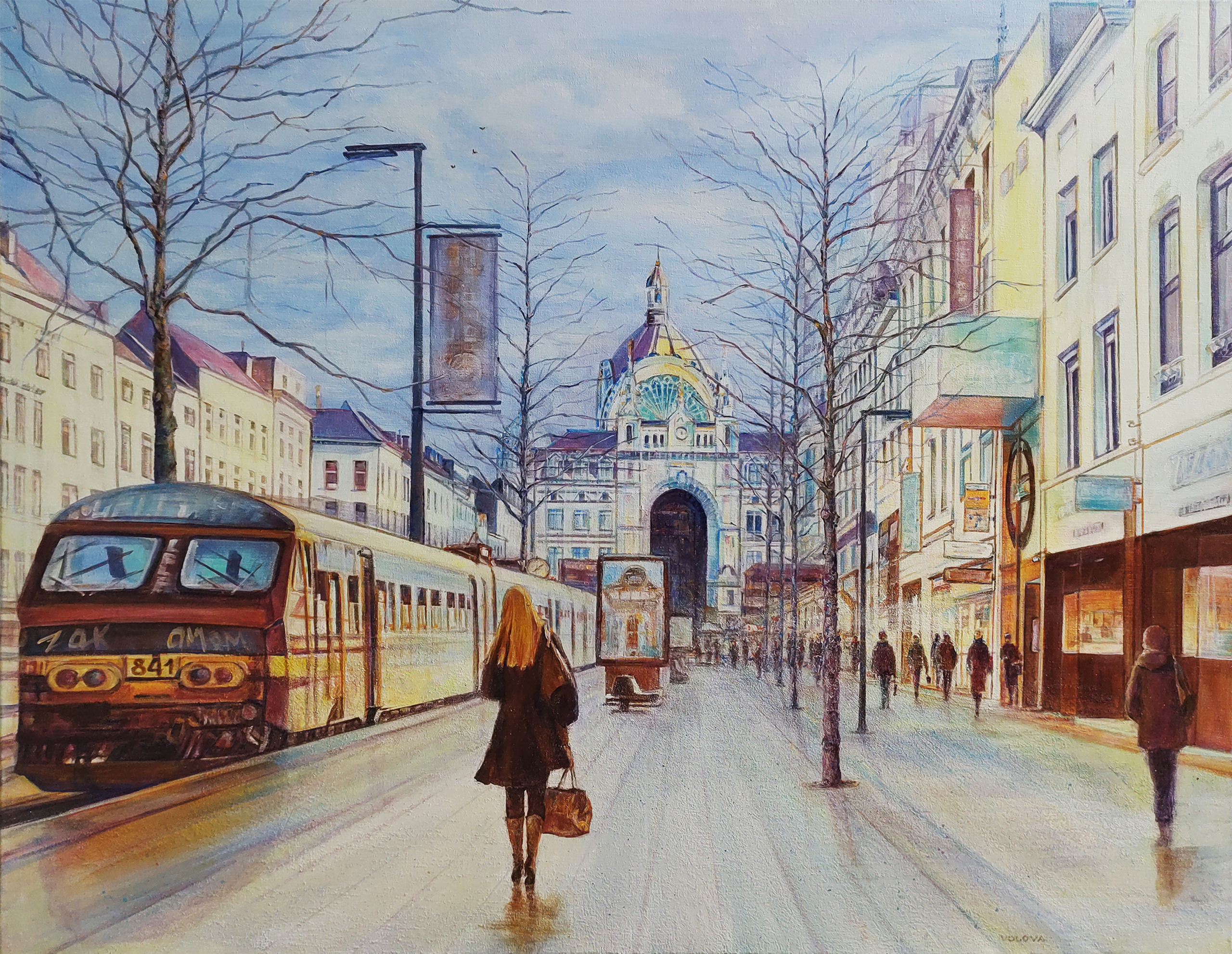 Mensen Acryl Paars Realistisch Architectuur Stad Station Trein Straat Train