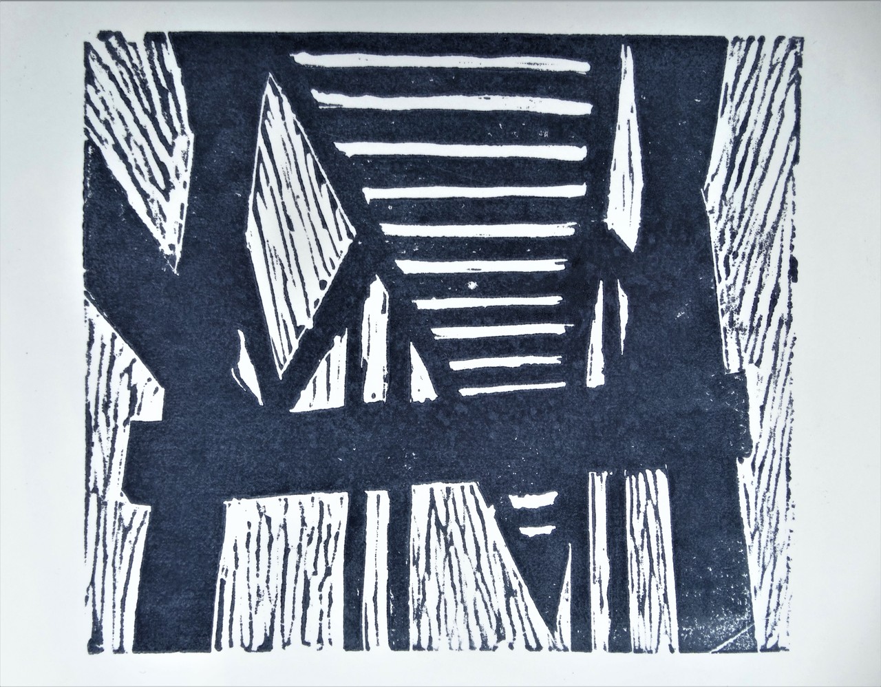 Wat als / een brug alleen bestaat/ in je droom? / en er een werkelijk afgrond / voor je ligt? (linografie, beeld 15x13, papier 20x18 cm, in lijst incl museumglas 37x39 cm) totale serie 4 ex.