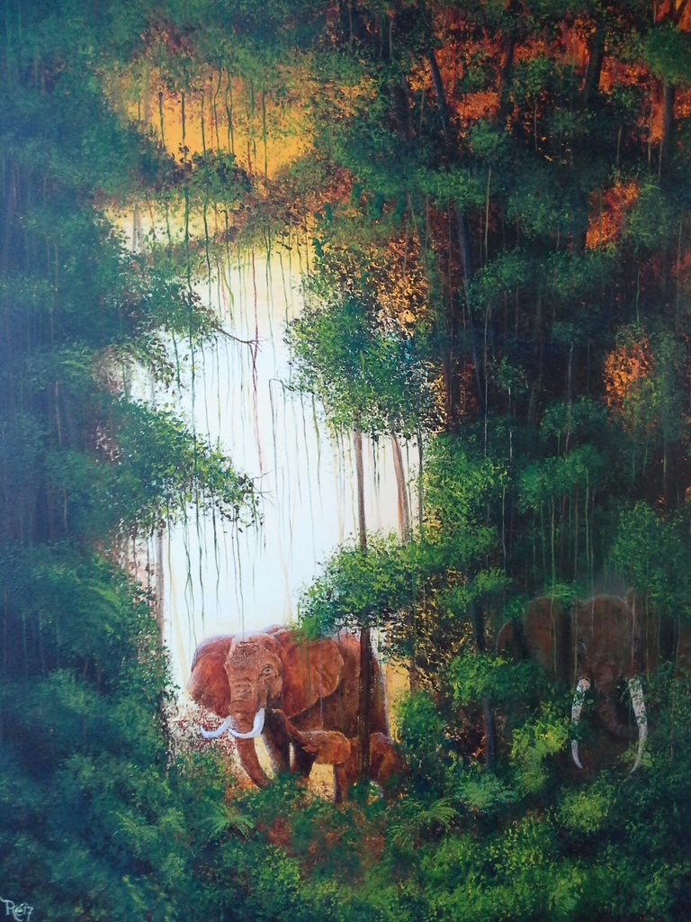 Vandaag in Zorgatelier Eindhoven het volgende schilderwerk af kunnen maken, Olifanten in het woud geschilderd, om je heen vogelgeluiden hier en daar wat geritsel, dan door een openstuk olifanten zo geruisloos als wat.